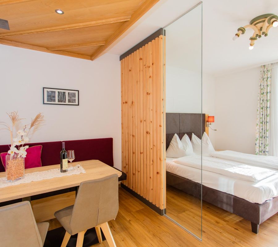 Die elegant eingerichtete Ferienwohnung „La Terrassa“ mit viel Liebe zum Detail, ist mit einem Doppelzimmer mit Waschbereich samt Dusche und WC ausgestattet. Das Wohnstudio hat viele Facetten und hebt sich von den anderen Wohnungen ab, da sie vor allem im traditionell alpenländischen Stil eingerichtet wurde. Es befindet sich auch noch ein Dreibettzimmer in der Wohnung, welches ebenfalls einen Waschbereich samt Dusche und WC besitzt. Im gemütlichen Wohnbereich ist eine komfortable Schlafcouch zu finden. Die Küche ist modern ausgestattet mit einem 4-Platten Cerankochfeld inklusive Backofen, einem BORA-Dunstabzug, Geschirrspüler, Wasserkocher, Kühlschrank samt Gefrierfach und einer Kaffeemaschine. Die gemütliche Essecke lädt zu einem geselligen Beisammensein mit den Liebsten ein. Ein besonderes Highlight der Ferienwohnung „La Terrassa“ ist der große Balkon mit herrlichem Blick zum See und auf die höchsten Berge Österreichs. Für zusätzliche Unterhaltung sorgen 2 Flat-TV Geräte und kostenloses W-LAN. Die gezielte Planung der Ferienwohnung und das Einsetzen von hochwertigen Materialien garantieren einen erlebnisreichen und erholsamen Urlaub im Hotel Garni Hettlerhof.